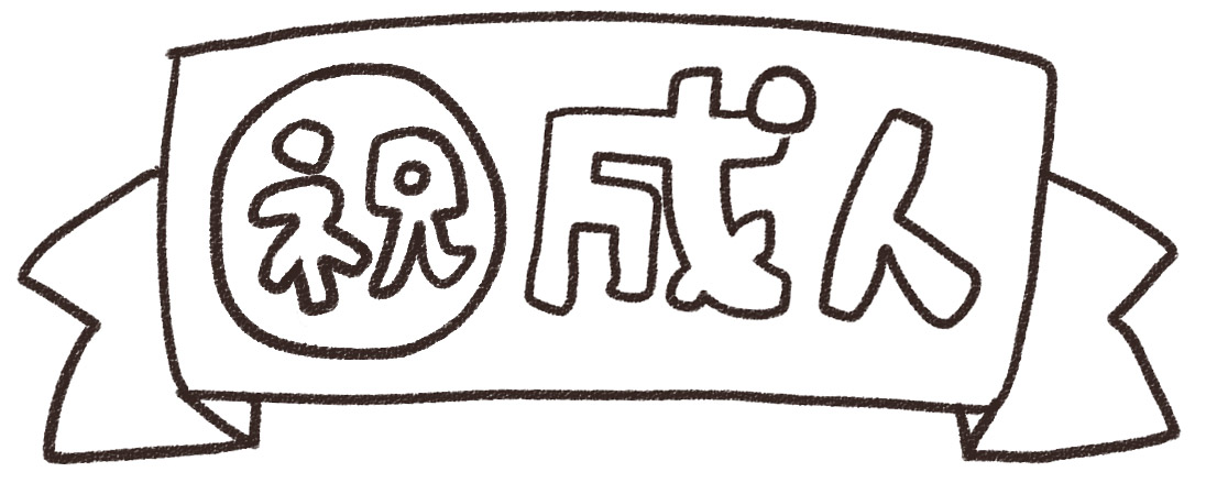 黄色いリボンに「祝・成人」と描かれた、イラスト文字です。